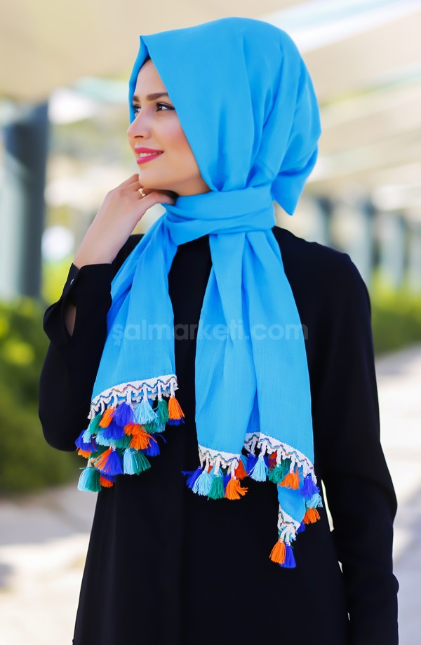 RENKLİ PÜSKÜLLÜ KETEN ŞAL - TURKUAZ